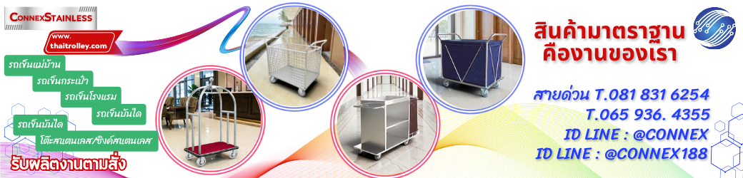 | โรงงานผู้ผลิตและจำหน่าย รถเข็น, รถเข็นโรงแรม, รถเข็นบันได, บันได, รถเข็นแม่บ้าน, รถเข็นผ้า, รถเข็นโรงงาน, รถเข็นของ, รถเข็นสองล้อ (หลังโค้ง/หลังตรง), รถเข็บเก็บผ้า, อุปกรณ์โรงแรม, รถเข็บพับเก็บได้, รถเข็นสำนักงาน, รถเข็นสแตนเลส, รถเข็นเอกสาร, รถเข็นของ, พาเลท Shop/Sale Trolley, Cart, Hand Truck, Trolley Stainless Steel สินค้ายี่ห้อคอนเน็กซ์ |